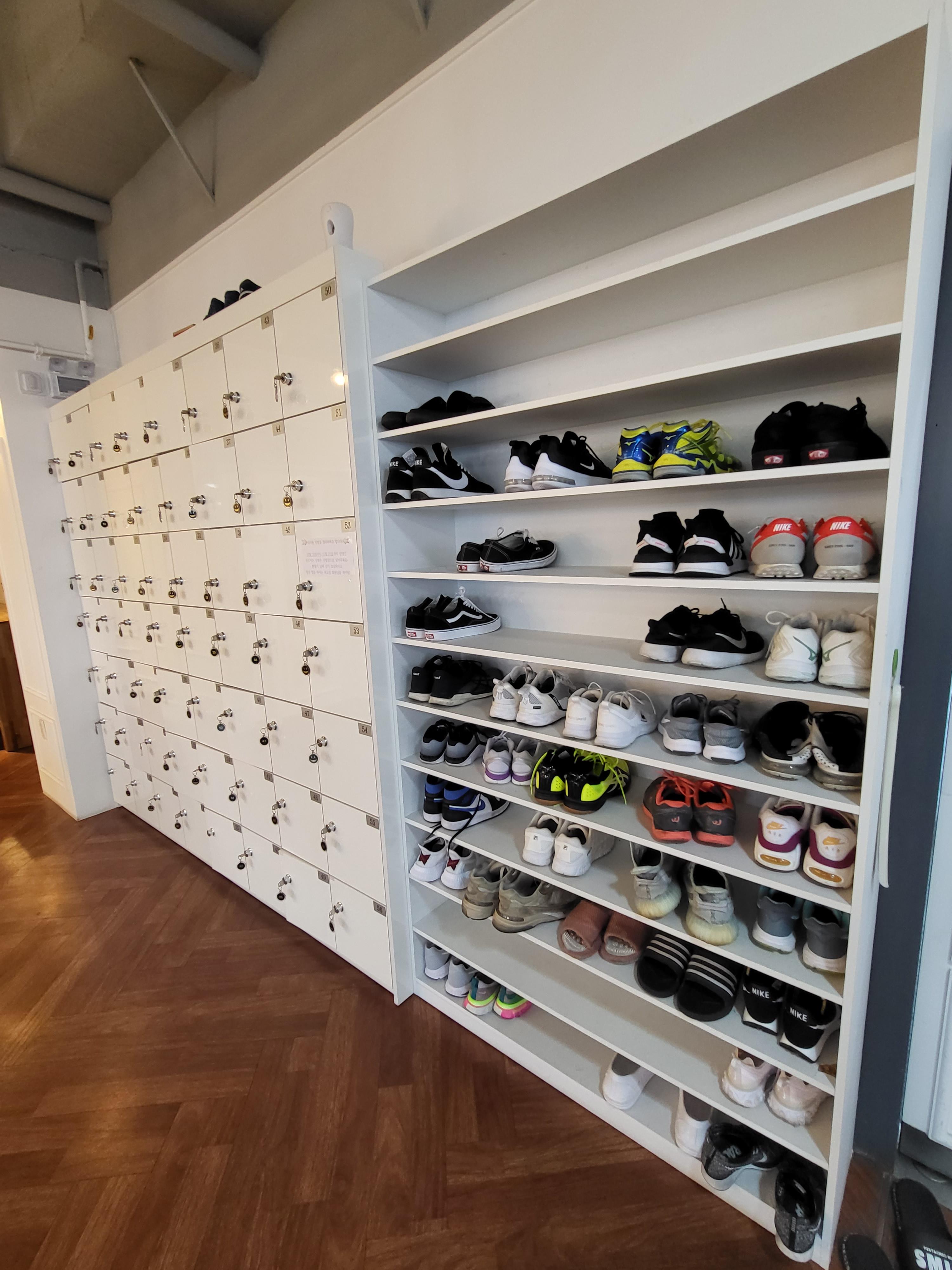 입구 옆에 있는 신발장과 락커예요. 운동할 때 신는 운동화를 매일 안 가지고 오고 두고 다닐 수 있어서 편해요!