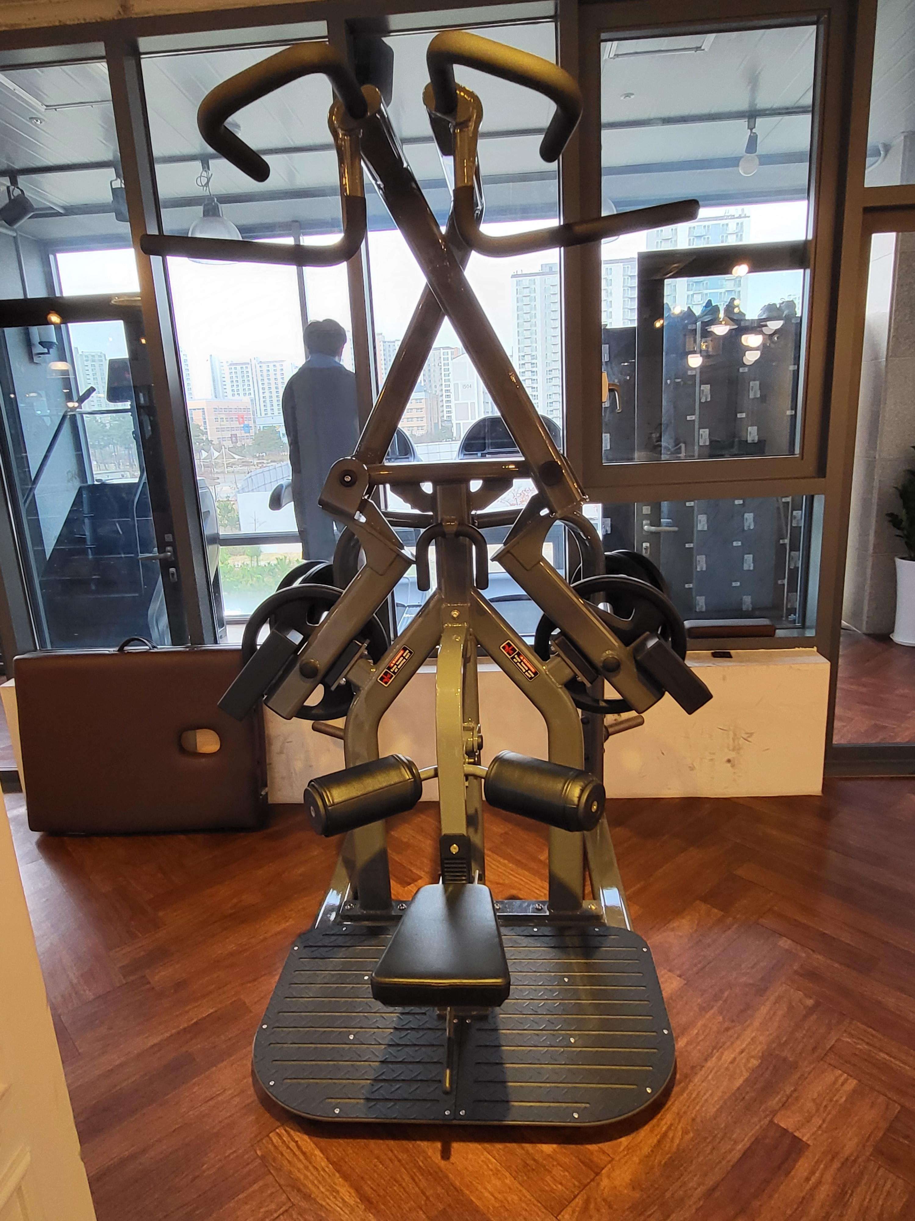 저 위에 손잡이 들고 위아래로 올렸다가 내렸다가 하면서 등 운동하는 기구예요! 뒤쪽에 저 원모양 추가하면서 중량을 조절하면서 사용해요.