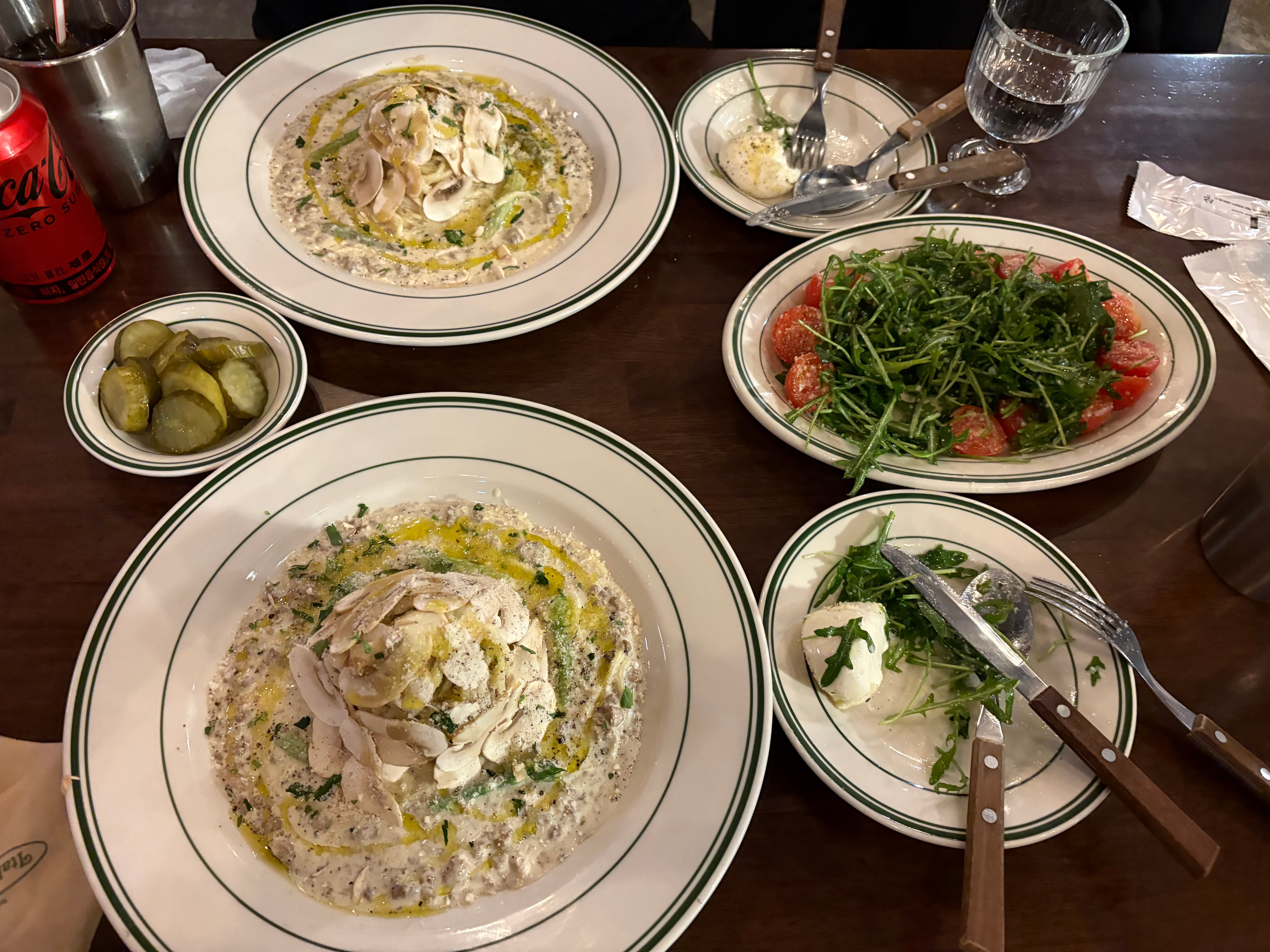 무조건 여기에서는 화이트 라구를 먹어야 한다며 화이트 라구 2개와 부라타 치즈 샐러드 주문했어요🤍
