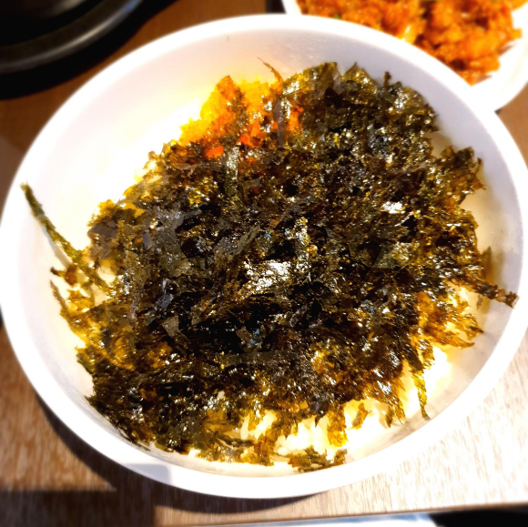 그리고 김과 무쌈 깻잎 등 주메뉴들과 싸 먹을 수 있도록 기본 반찬들이 나옵니당.