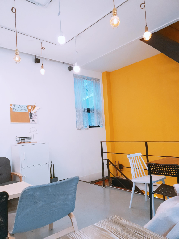 노란 벽면 하고 청록색 의자 색감 너무 예쁘지 않나요!?