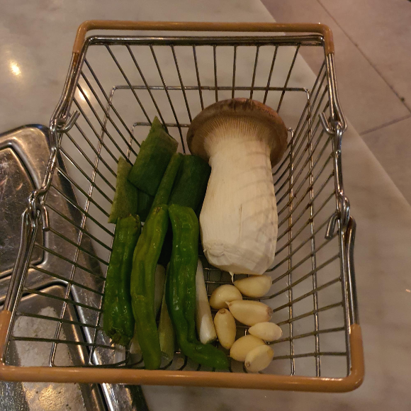 또 귀여운 바구니에 꽈리고추, 파, 마늘, 버섯을 주더라구요. 저는 저기 중에 버섯만 먹고 나머지는 패스 했어요ㅋㅋ