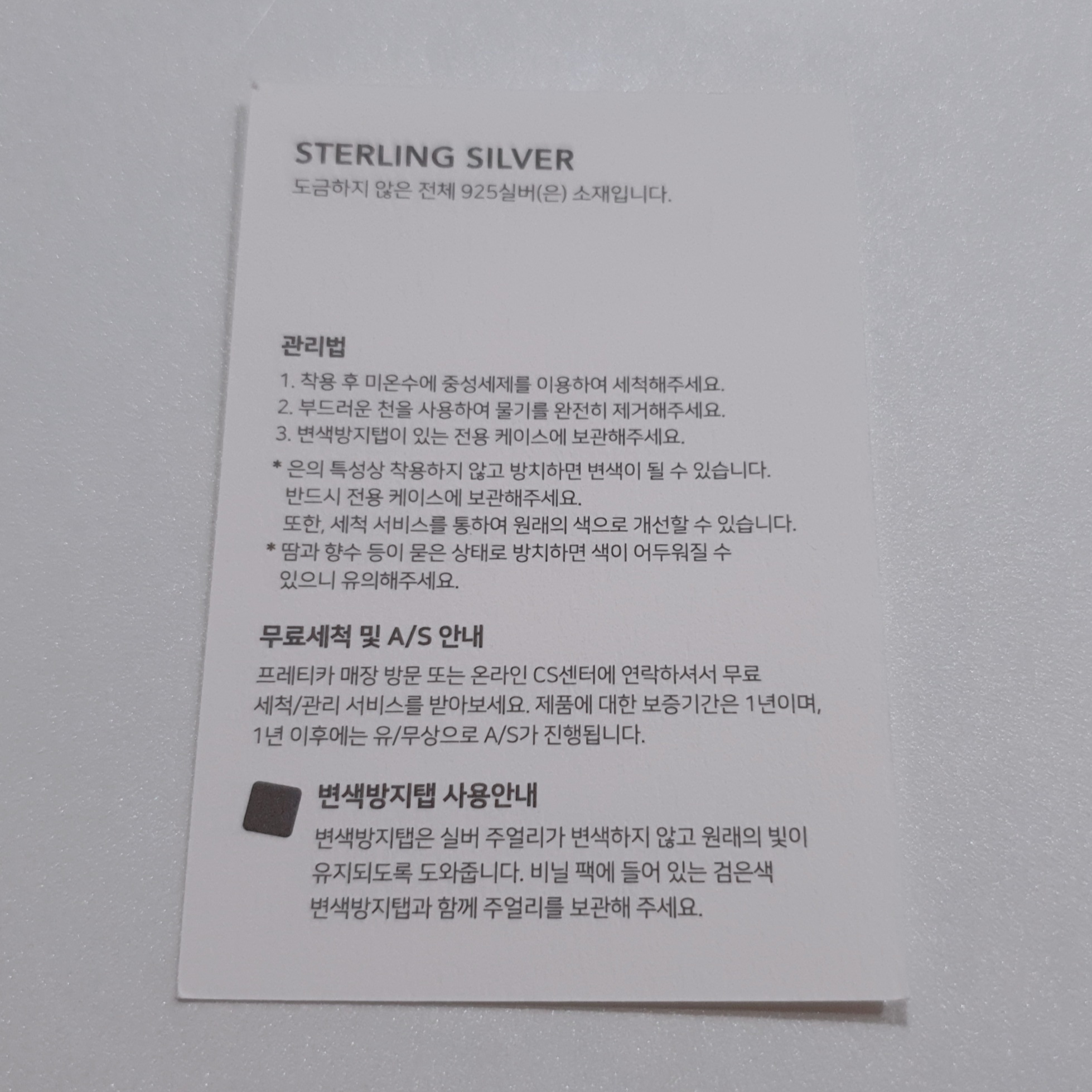 함께 온 센스 있는 종이에는 이렇게 매장 정보와 실버 관리 설명서가 적혀있어요.